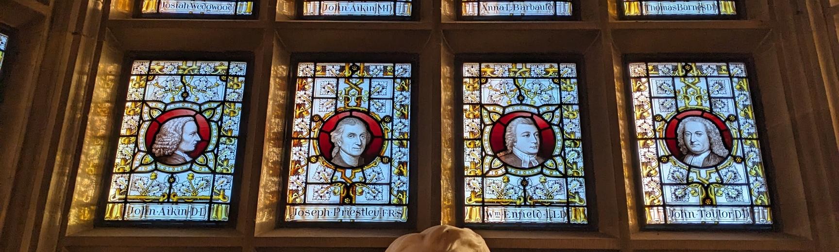 The Warrington Windows in the Library celebrate the Aikin family.  Here you can see Mrs Barbauld, Rev John Aikin D.D., and John Aikin M.D.