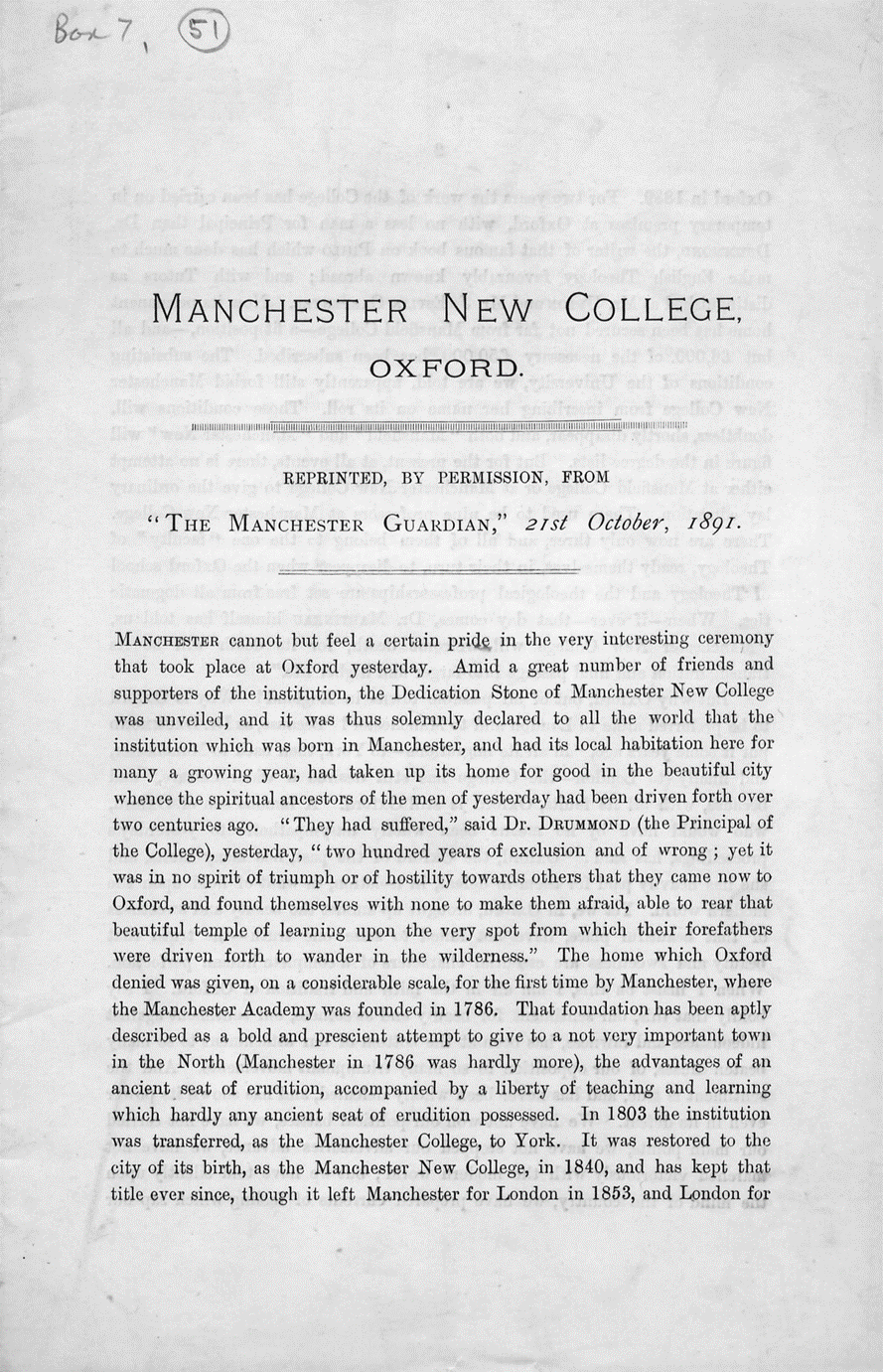 As you’d expect we have a significant amount of material in our archive reporting on the relocation and opening of college in Oxford. A fuller exhibition of the documents will be forthcoming, but contained within the material is a pamphlet reprinting a report in TheManchester Guardian covering the ceremony for the laying of the foundation stone. It’s interesting to note that the College is still being called Manchester New College in the article. The ‘New’ was soon dropped and in reports of the official opening of the College’s building, a few years later, it is known as Manchester College, Oxford. The pamphlet can be read below or in PDF form by clicking here.